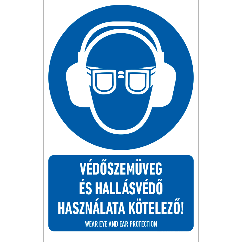 Védőszemüveg és hallásvédő használata kötelező! matrica / tábla (piktogram + felirat)
