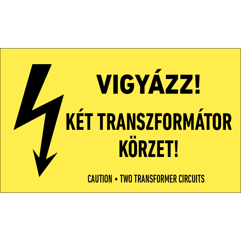 A „Vigyázz! Két transzformátor körzet!” a két külön transzformátorral működő körzetre figyelmeztet.