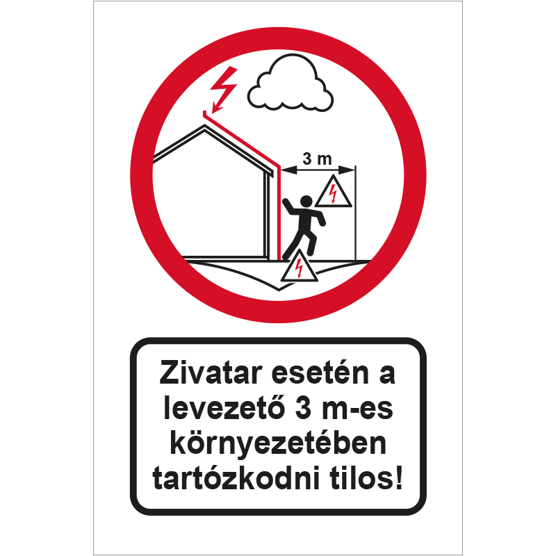 Zivatar esetén a levezető 3 m-es környezetében tartózkodni tilos! matrica / tábla
