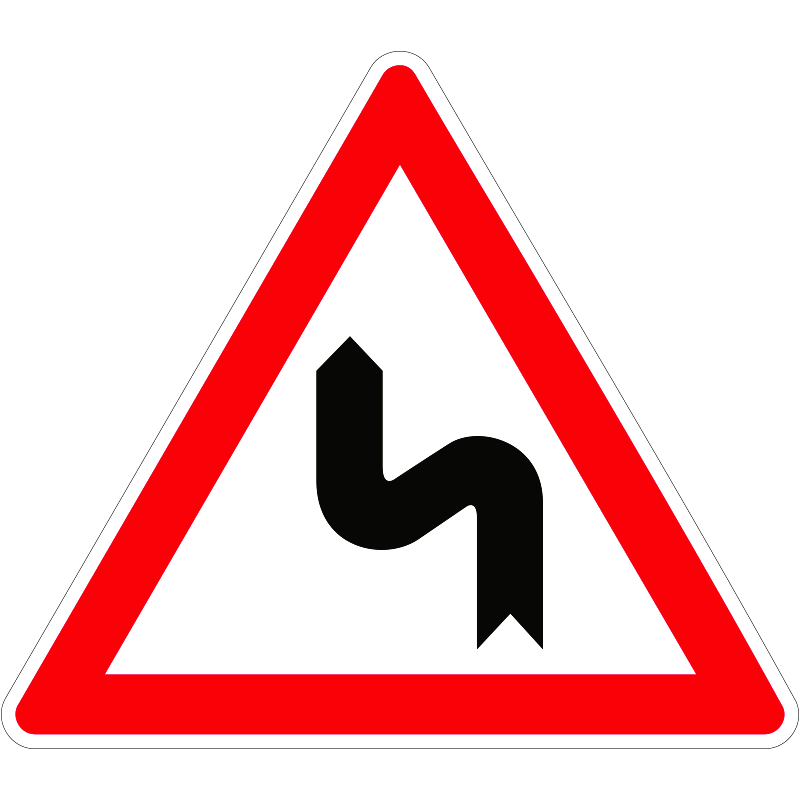 Egymás utáni veszélyes útkanyarulatok, első kanyar balra KRESZ közlekedési tábla