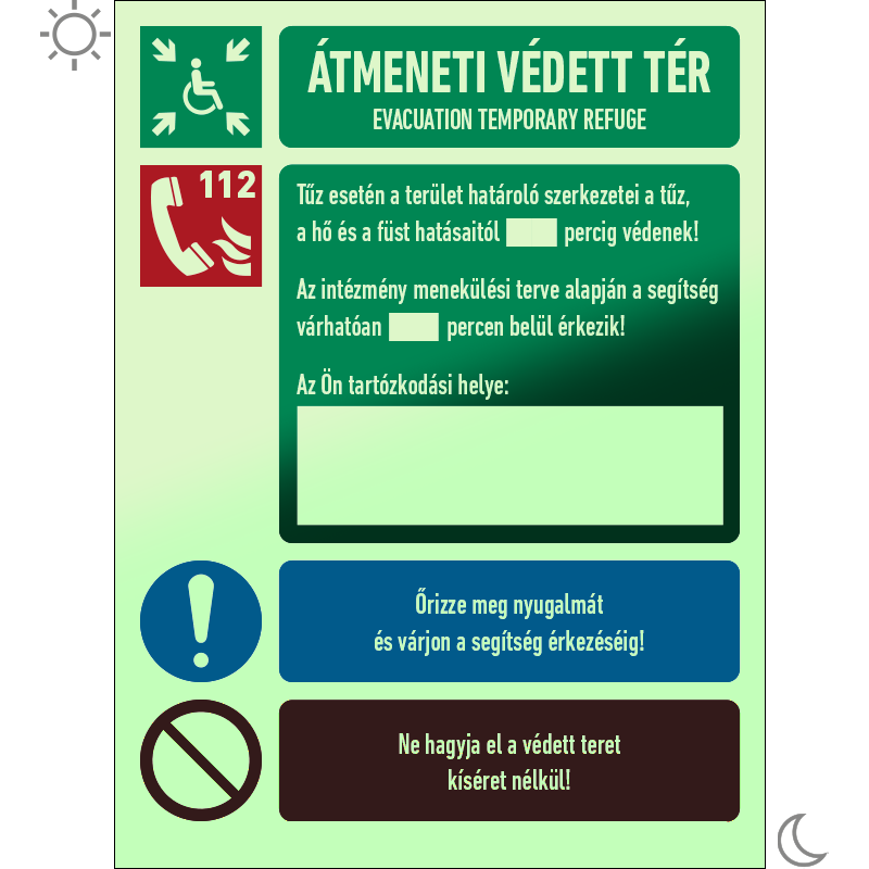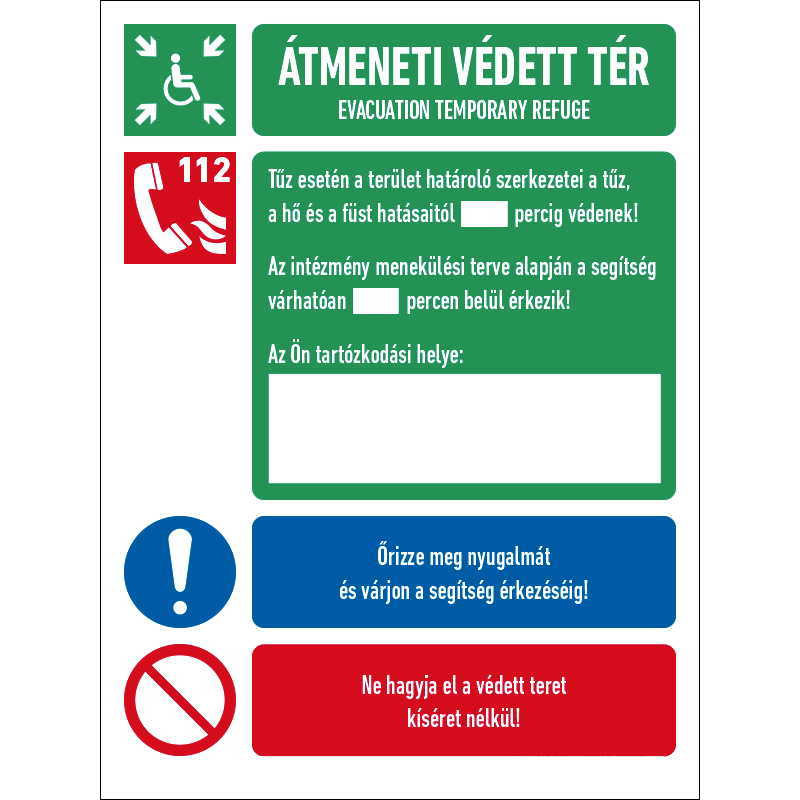 Az „Átmeneti védett tér” a tűz esetén az odamenekülő vagy -menekített személyek biztonságát átmenetileg, a mentés vagy a további menekülés végrehajtásáig biztosító területet jelző zöld alapon fehér piktogram.