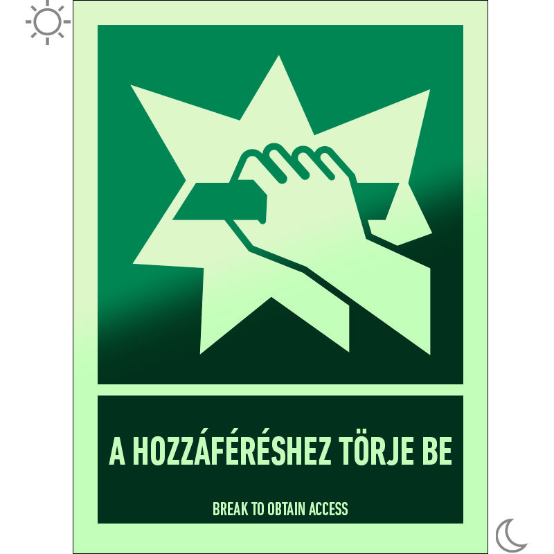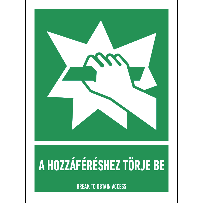 „A hozzáféréshez törje be!” a védőburkolat betörésére a figyelmet felhívó zöld alapon fehér piktogram.