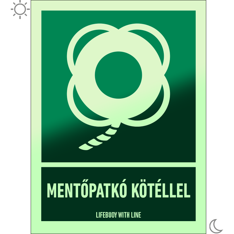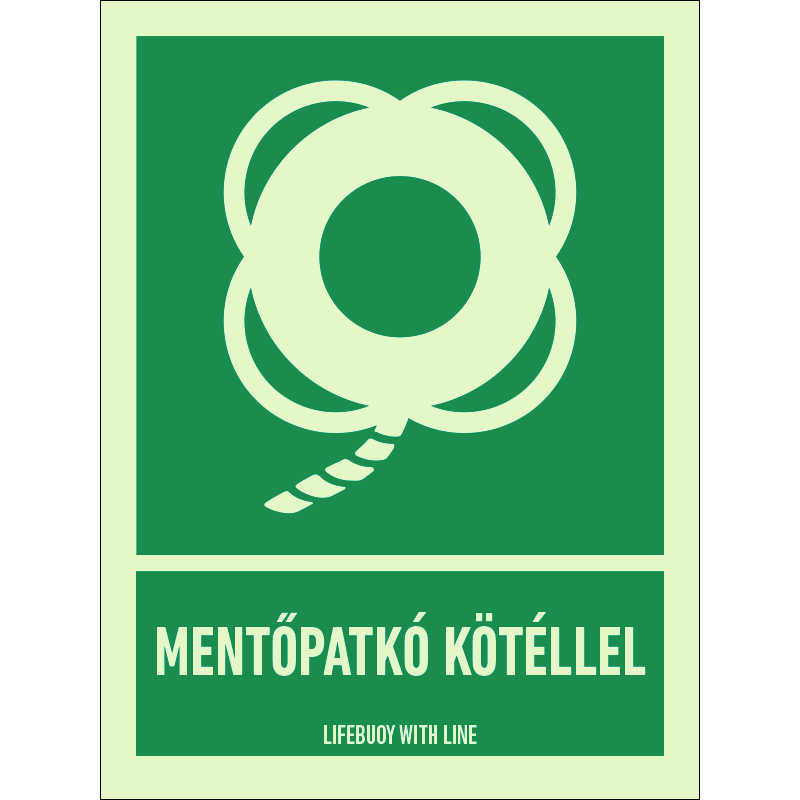 A biztonsági jelzések közül kiemelt fontosságúak a menekülési utakat jelölők. Minden ilyen termékünk sötétben utánvilágító kivitelben is készül. A „Mentőpatkó kötéllel” a hajón található kötéllel ellátott mentőpatkó helyét jelző zöld alapon fehér piktogram.