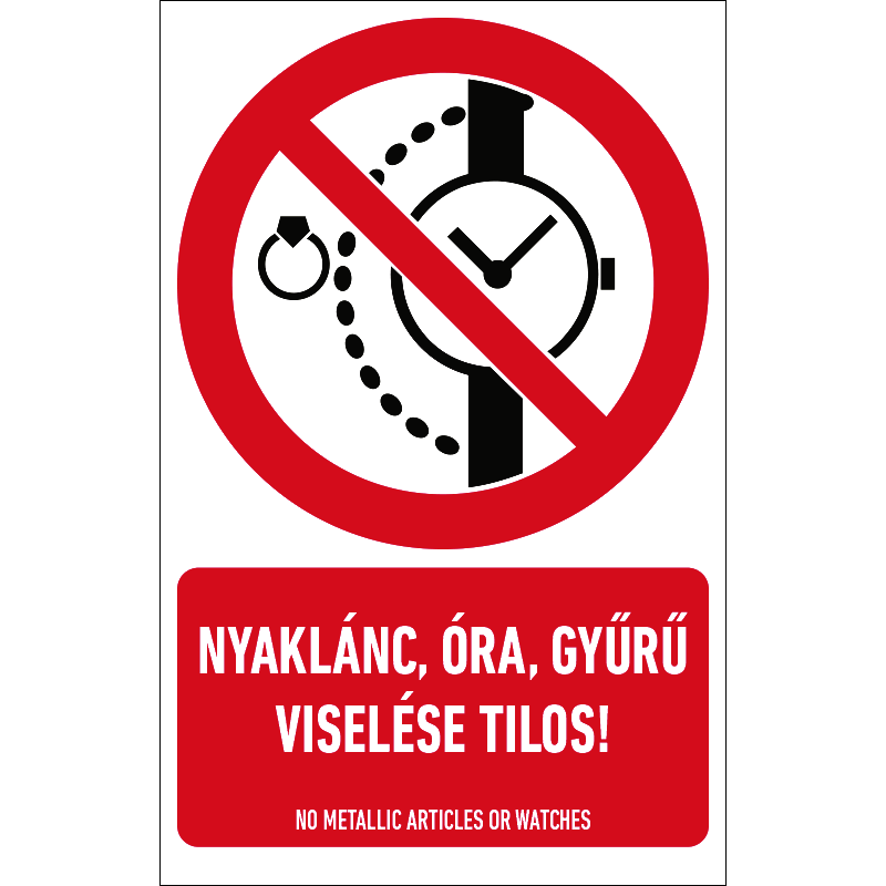 A tiltó jelzések a biztonságot és az egészséget veszélyeztető magatartást tiltanak, valamint figyelmeztetnek a veszélyforrásra. A „Nyaklánc, óra, gyűrű viselése tilos!” az elektromágneses térbe fémtárgyat viselők belépését tiltó piktogram+felirat.