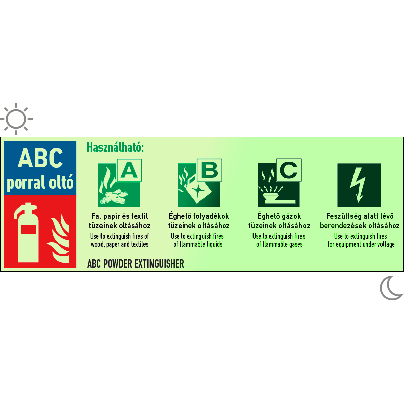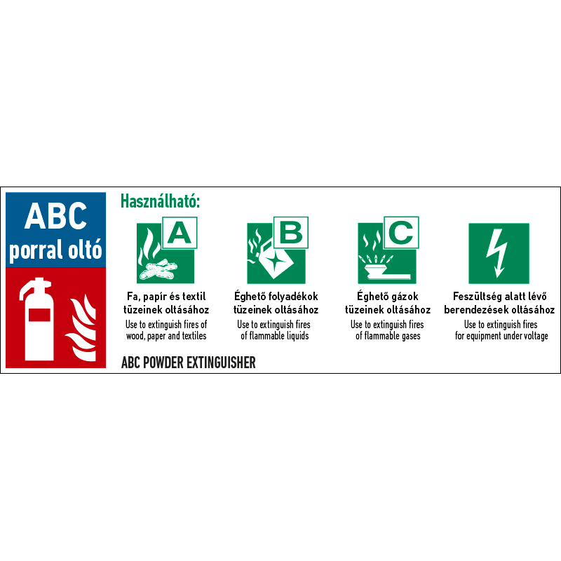 Az „ABC porral oltó készülék” az univerzális porral oltó tűzoltó készülék használatával kapcsolatos információkat tartalmazó piktogram+felirat.