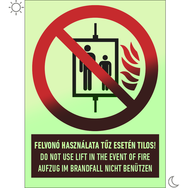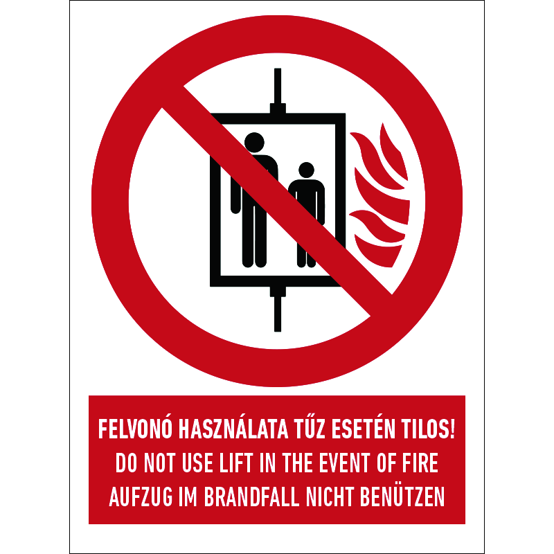 A tűzvédelmi tájékoztató jelzések a hatósági előírásoknak megfelelően jelölik az épületekben a tűzvédelmi berendezések és felszerelések helyét, elérhetőségét, illetve az épületben lévő anyagok tűzveszélyességét. A „Felvonó használata tűz esetén tilos!” a tűz esetén a felvonó használatát tiltó 3 nyelvű felirat.