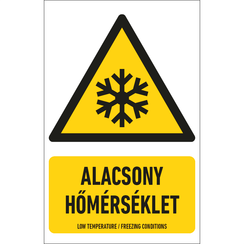 Az „Alacsony hőmérséklet” a kihülés vagy fagyás veszélyével járó alacsony hőmérsékletre figyelmeztető piktogram+felirat.