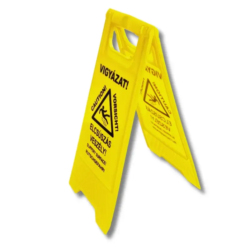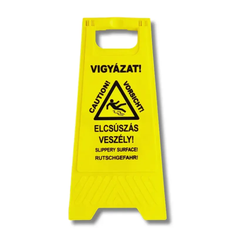 Az „Elcsúszás veszélye!” szétnyitható mobiltábla a síkos felületen az elcsúszás veszélyére figyelmeztet piktogrammal és három nyelvű felirattal.