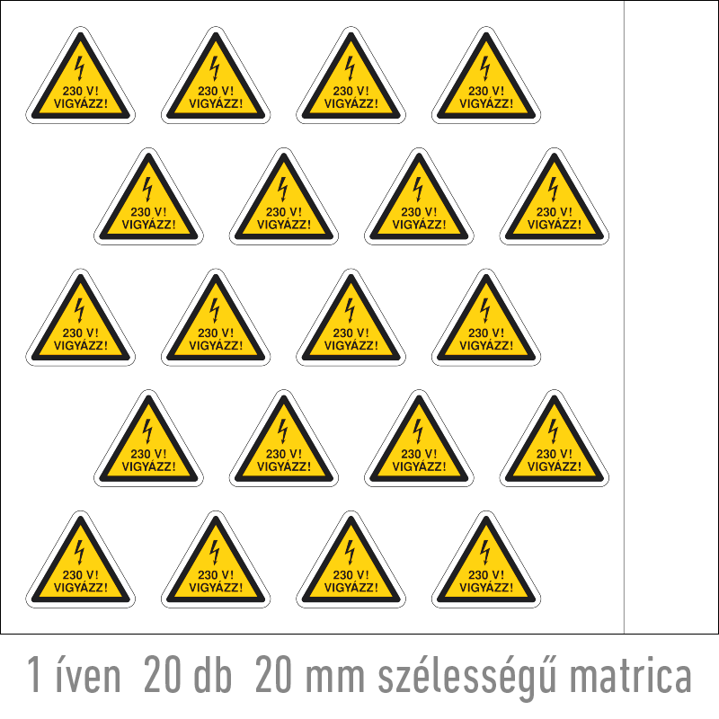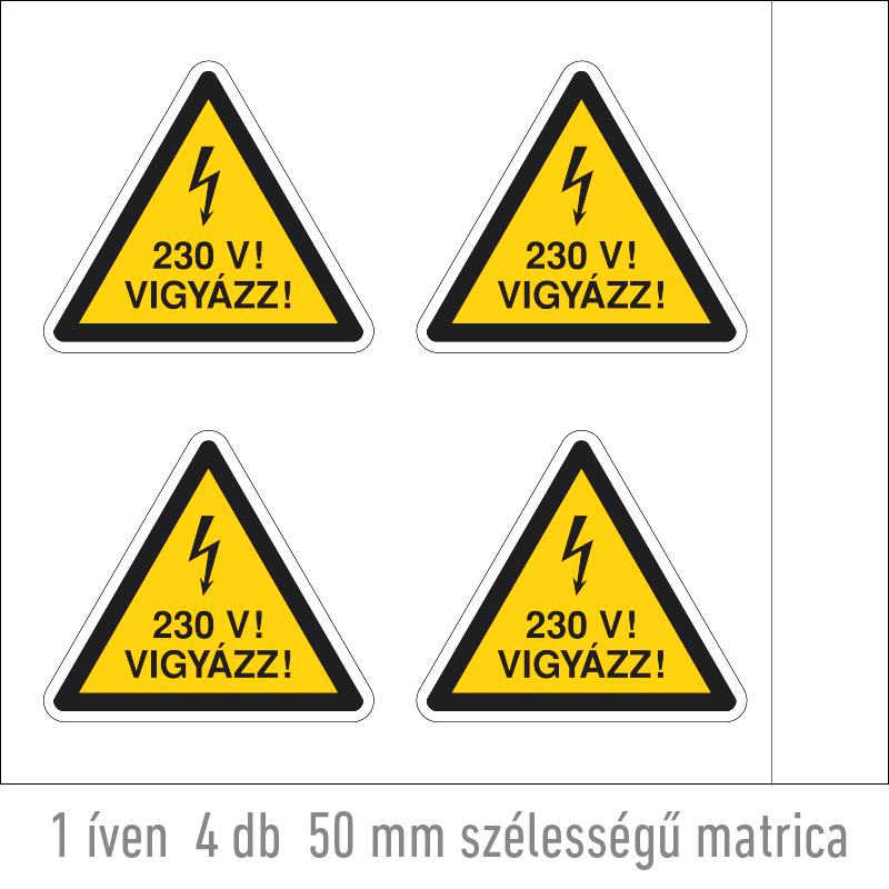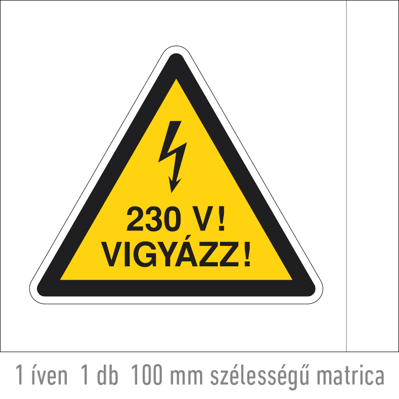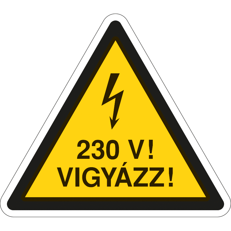 A „230 V! Vigyázz!” a nagyfeszültségű áram veszélyére figyelmeztető piktogram+felirat.